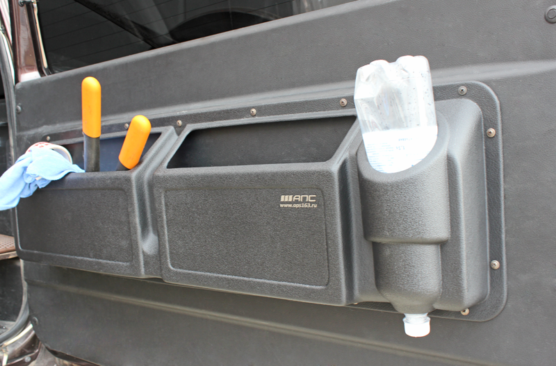В правой части кармана имеется цилиндрическая ниша для пластиковых бутылок объемом 1,5л.