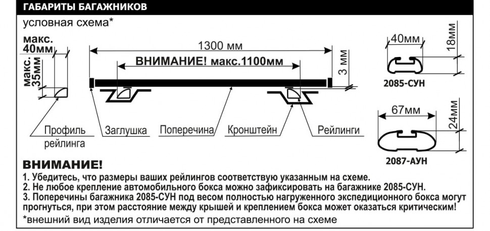 Крепление осуществляется в обхват профиля рейлинга. Для осуществления компетентного выбора, необходимо убедится в соответствии конструкций Багажника и рейлингов Вашего автомобиля: крепление багажника подходит для профилей которые имеют размеры по высоте не более 35мм, по ширине не более 40мм. Элементы крепления кронштейна закрываются пластмассовыми корпусами. Профиль попереречины ложится непосредственно на профиль рейлинга, опираясь на резиновую вставку. Поперечины багажника имеют стандартизированный Т-образный паз под установку дополнительных аксессуаров для багажников: крепление лыж, велосипедов, корзин, и прочего с соответствующим типом крепления. Поперечины багажника имеют обтекаемую форму, позволяющую уменьшить сопротивление потоку воздуха при движении автомобиля. Наличие антифрикционной вставки сверху профиля поперечин позволяет надежно закрепить груз и защитить от повреждений поверхность поперечин багажника. Вставка в нижний паз профиля предотвращает появление дополнительных аэродинамических шумов. - Багажник является съемным устройством, используемым в гражданских целях для размещения и закрепления на нем полезного груза, принадлежностей, дополнительных устройств и оборудования, перевозимых транспортным средством, а также для декоративного дополнения экстерьера автомобиля. - Оттенки цвета изделия, а также фактуры поверхностей могут визуально отличаться от представленных на сайте, в каталогах или демонстрационных моделях. Видовыми поверхностями изделия являются те стороны, которые после установки на автомобиль обращены фронтальными частями к смотрящему человеку, стоящему на земле. На невидовых поверхностях допускаются дефекты в виде рисок, ворсинок, неровностей, или включений другого цвета, если их размеры не более 0,5мм по ширине и 3мм по длине.Характеристики